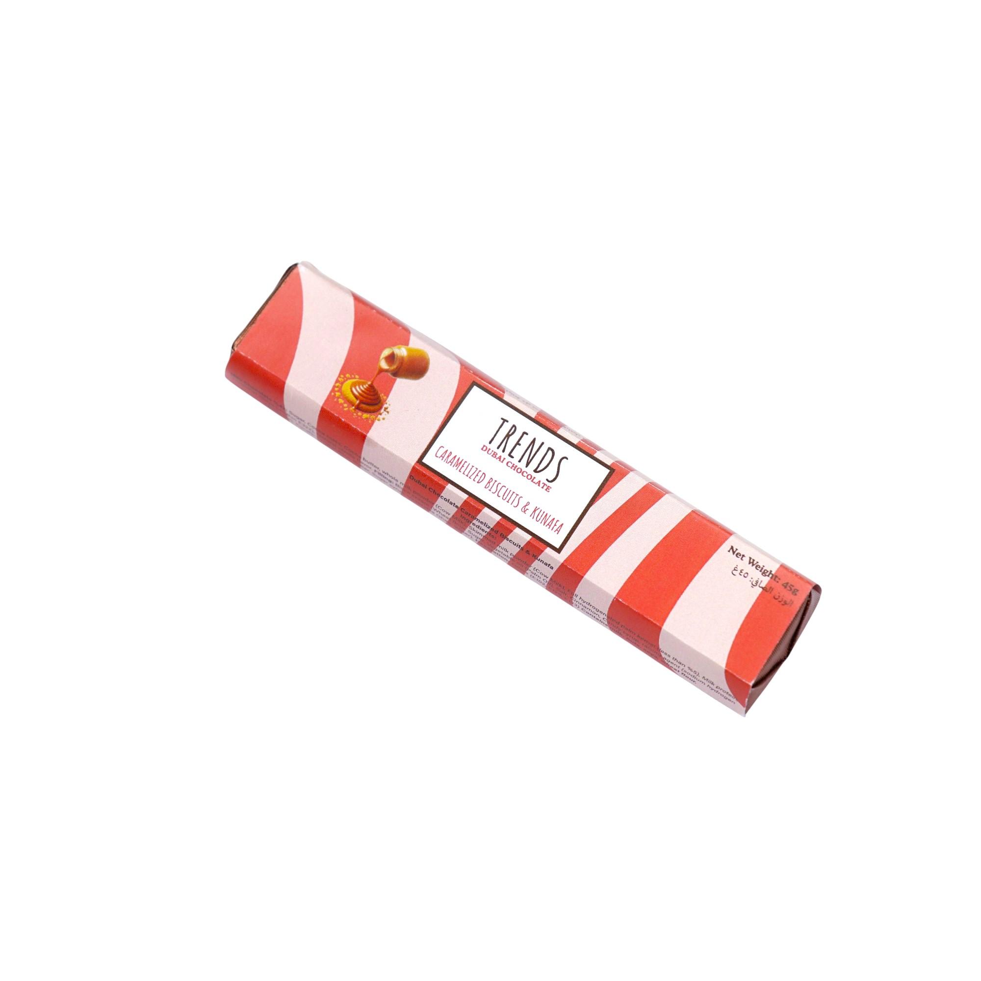 Trends’ Caramelized Biscuit and Kunafa Chocolate is a unique fusion of two beloved Flavors. The smooth, rich chocolate is combined with the caramelized crunch of biscuits and the delicate, golden strands of kunafa. With every bite, you’ll experience the perfect harmony of sweet, creamy, and crispy textures, creating a luxurious treat that bridges tradition and innovation. Indulge in this exquisite chocolate and Savor the essence of Middle Eastern indulgence like never before.